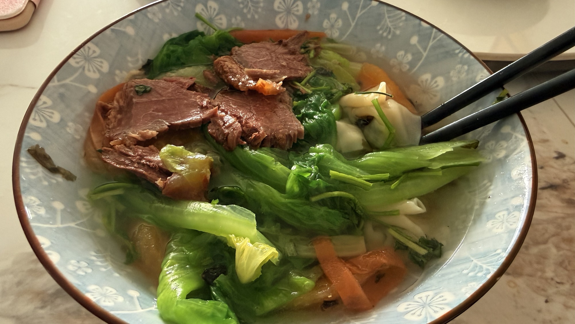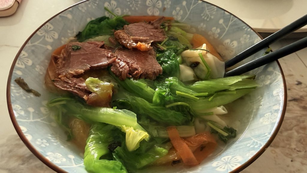 一颗生菜、一个西红柿、10 颗盒马馄饨,再加上二姨之前给卤好的牛肉,早餐就准备好了。还别说,吃的还挺舒服的。