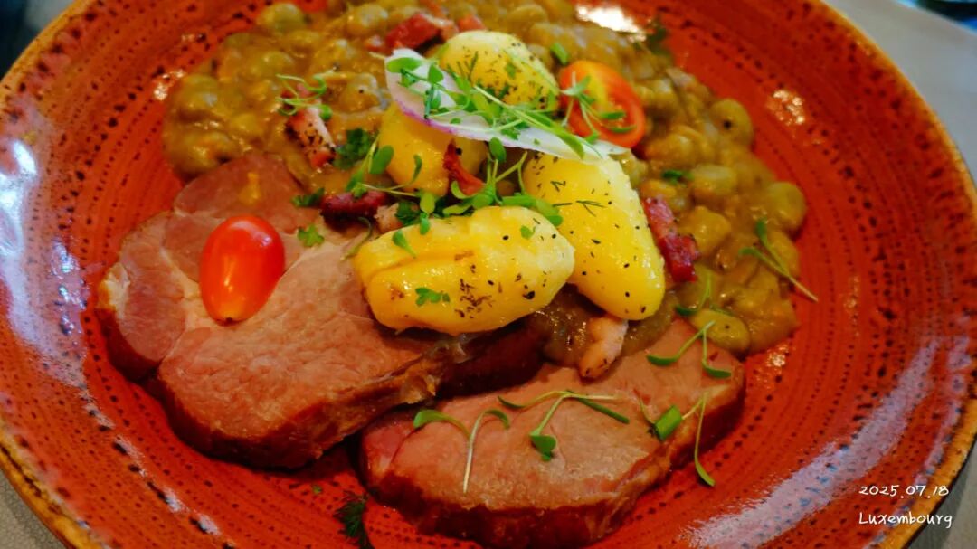 给媳妇点的是猪颈肉,这两个都是 卢森堡 当地的特色。必须拿下,品尝一番。