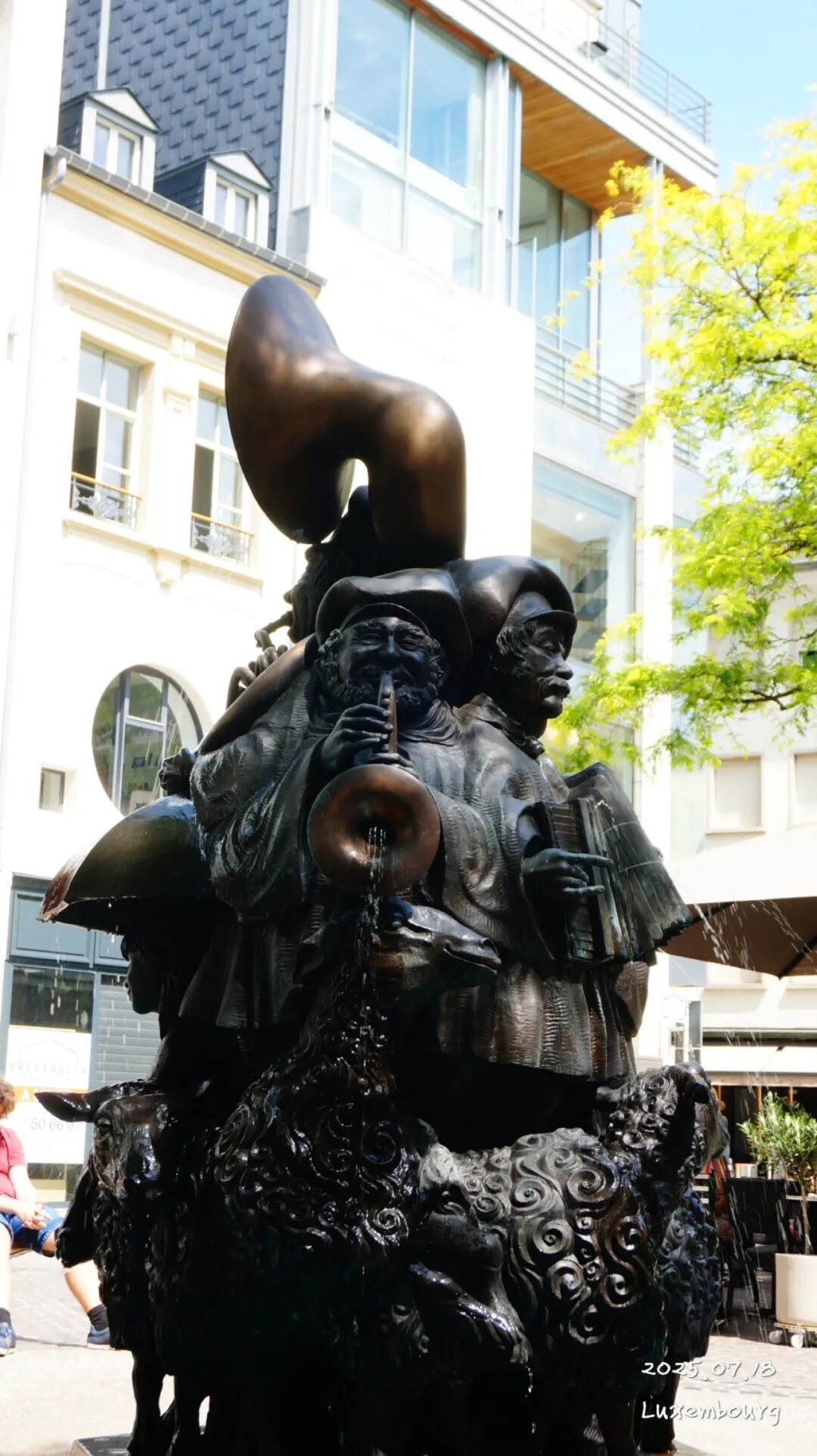 这个喷泉的设计非常独特,底部是一个山羊,上面则有几位正在吹奏乐器的人物雕像,象征着音乐和艺术的结合。这个喷泉不仅是一个美丽的景观。我还刻意给我媳妇解释了一番这个故事,只是有可能和实际不符。