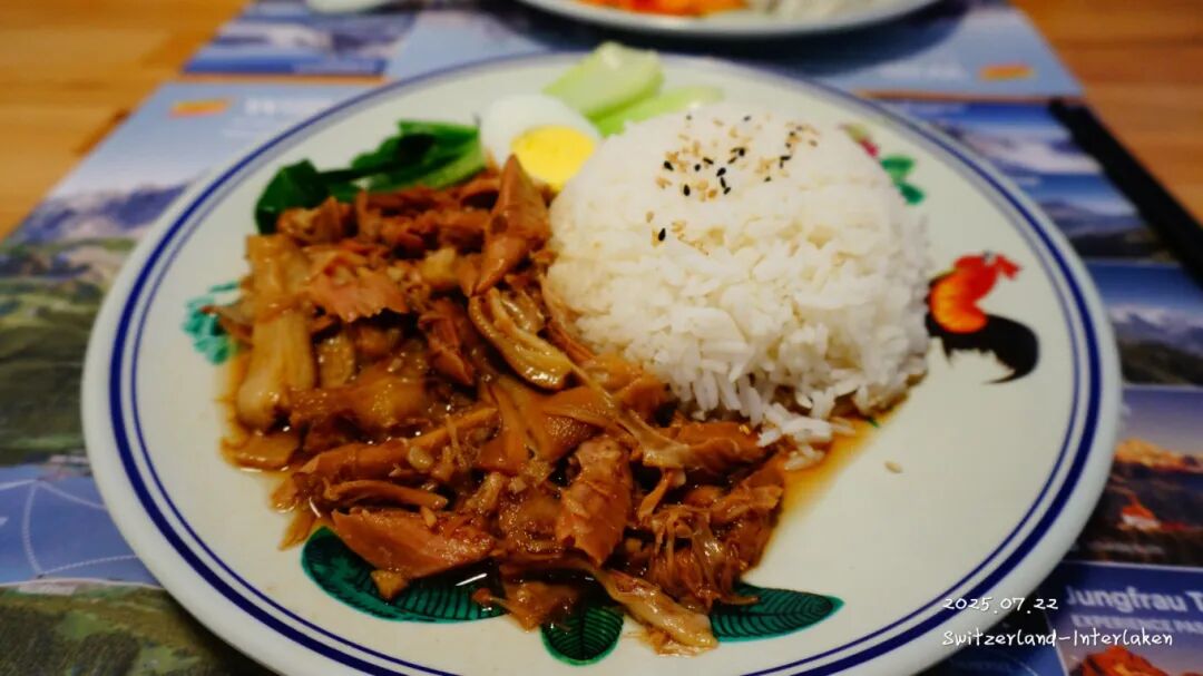 随便找了个餐厅,本来想去西餐厅的,但是这个时间段都没有开门,所以就选了个比较热门的中餐厅,但进去一看,全是 中国 旅行团,算了算了,赶紧出来,正好旁边也有个中餐馆,进去随便吃吧。点了个猪脚饭,西红柿鸡蛋盖饭,还有个肉夹馍,一共400多块钱,这 瑞士 的物价,确实不便宜,这要是在国内,也就50多。